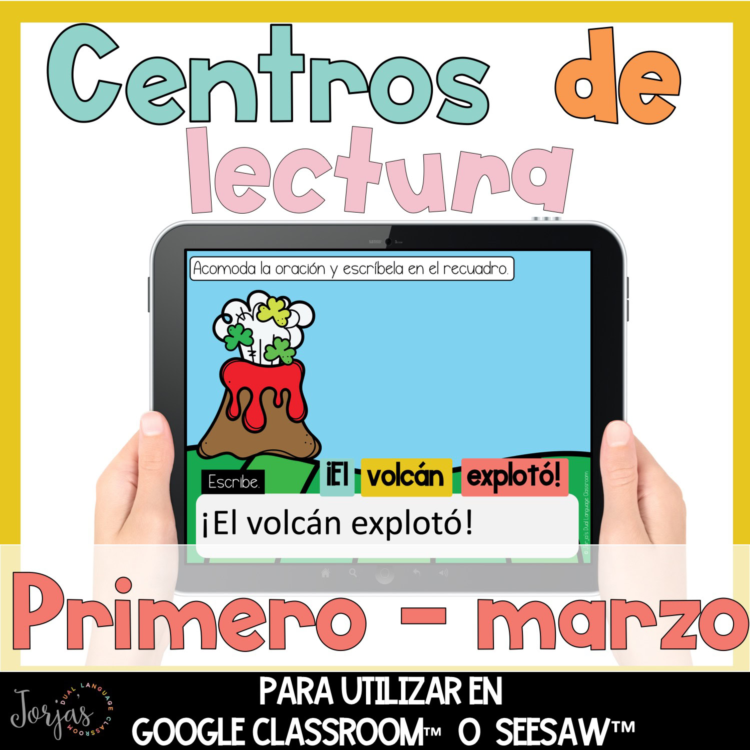 Actividades digitales de lectura primero marzo Seesaw Google Slides in Spanish. Estos centros de lectura están listos para que los utilices en Google Slides™ o en Seesaw™ para utilizar más tecnología en tu salón.