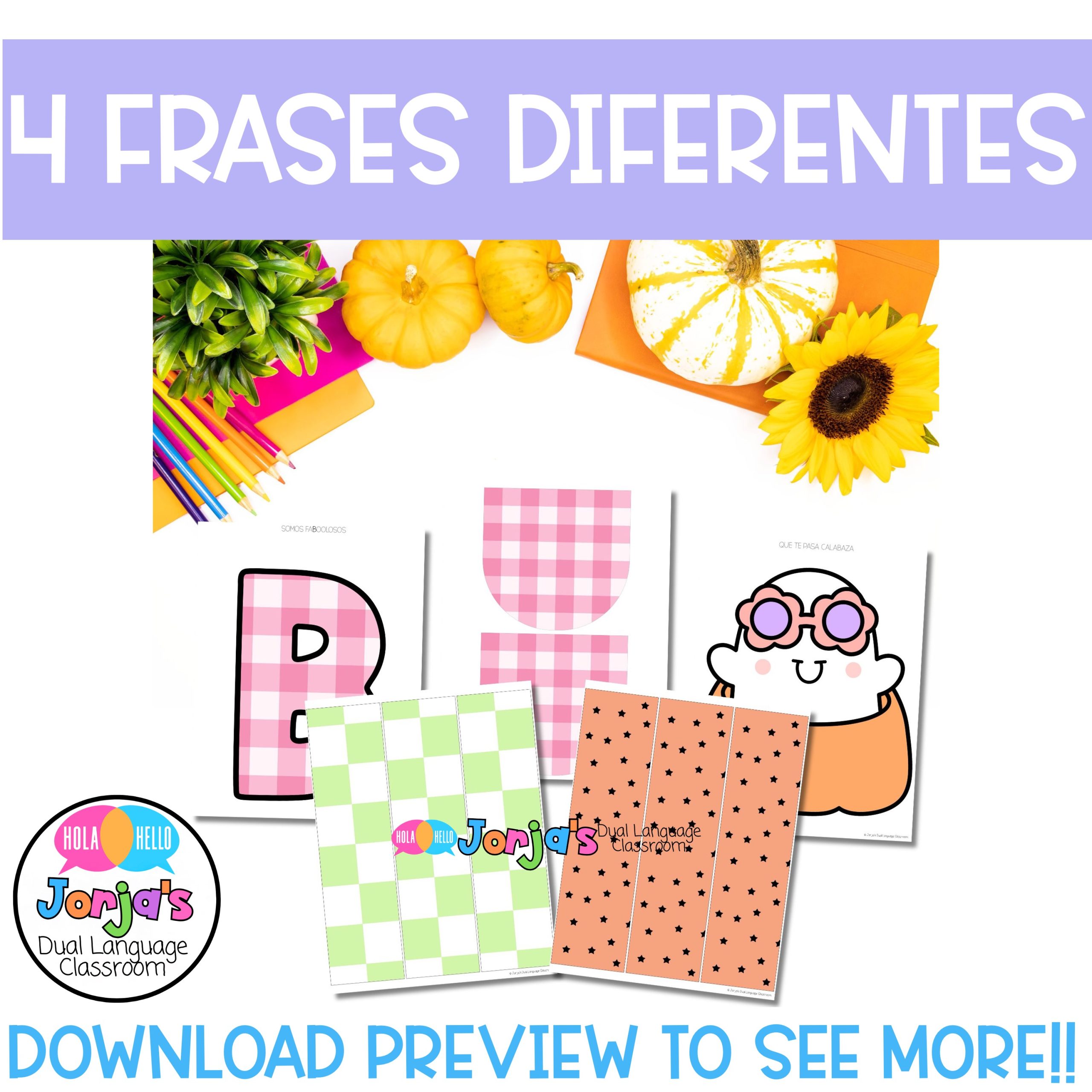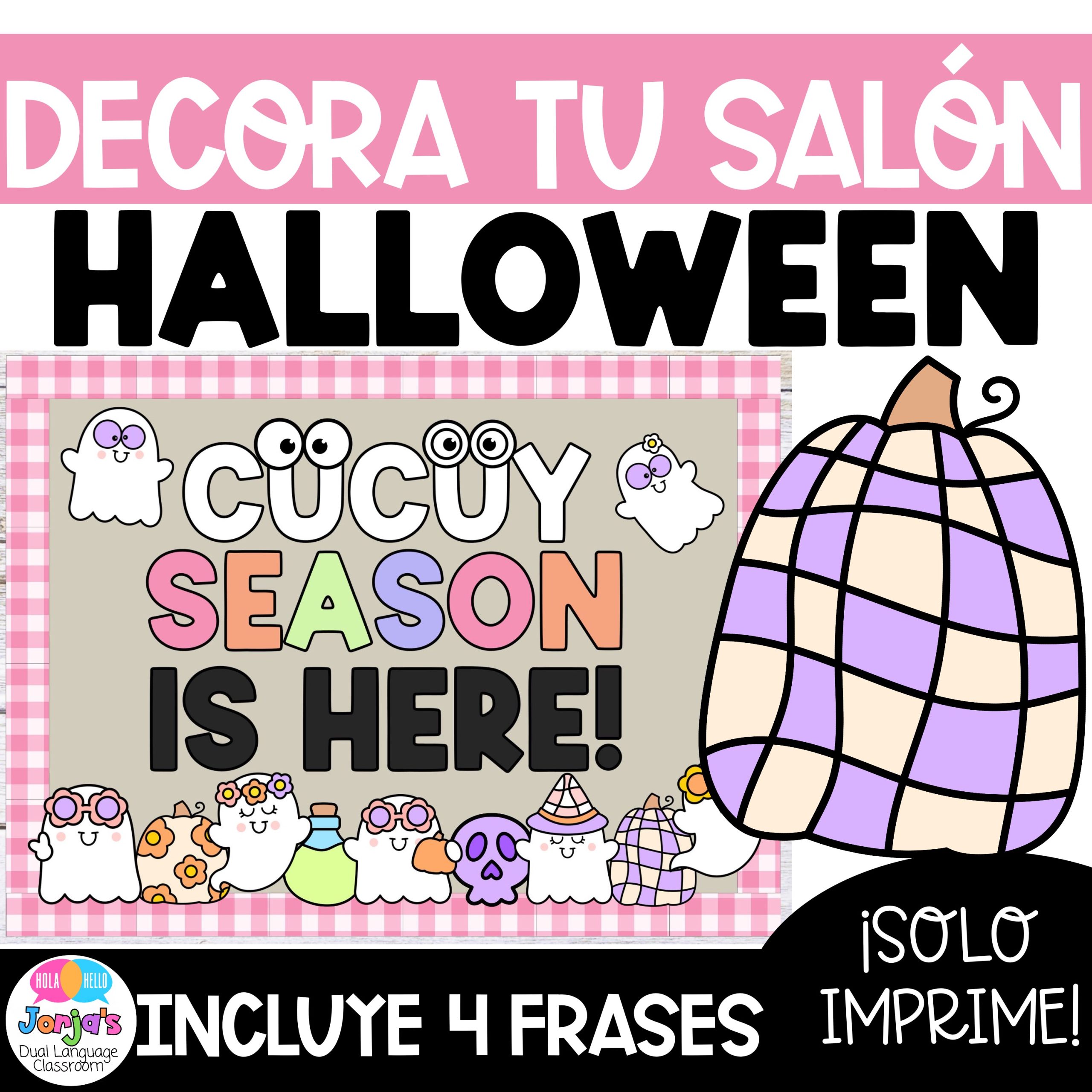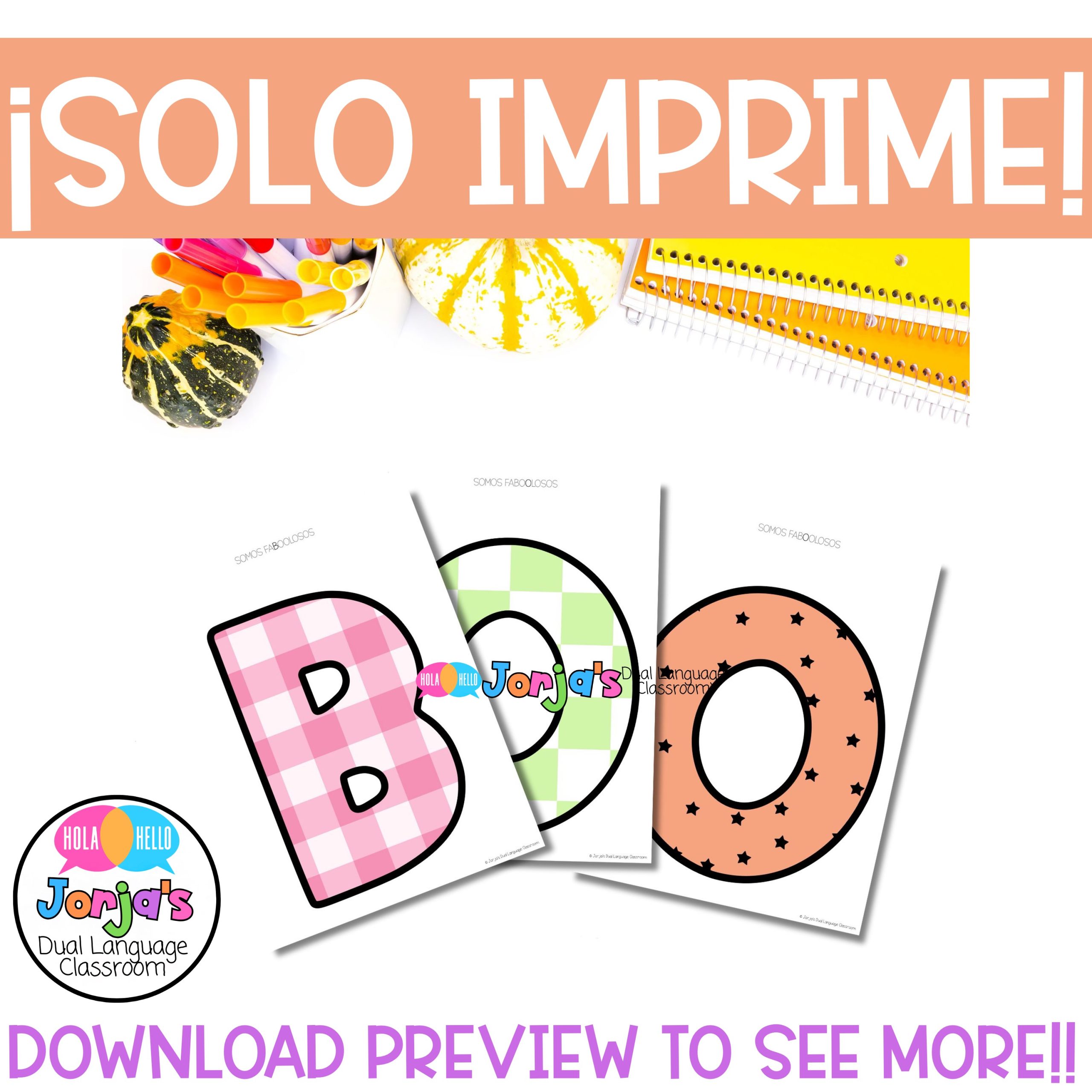 Bulletin Board in Spanish Halloween Decora tu salón en español – Este recurso de decoraciones de Halloween en español es una manera rápida y divertida de darle vida a tu salón en octubre. Incluye frases listas para imprimir en color y blanco y negro, con mensajes creativos como “Somos fa-boo-losos”, “Cucuy season is here” y “¿Qué te pasa calabaza?”.