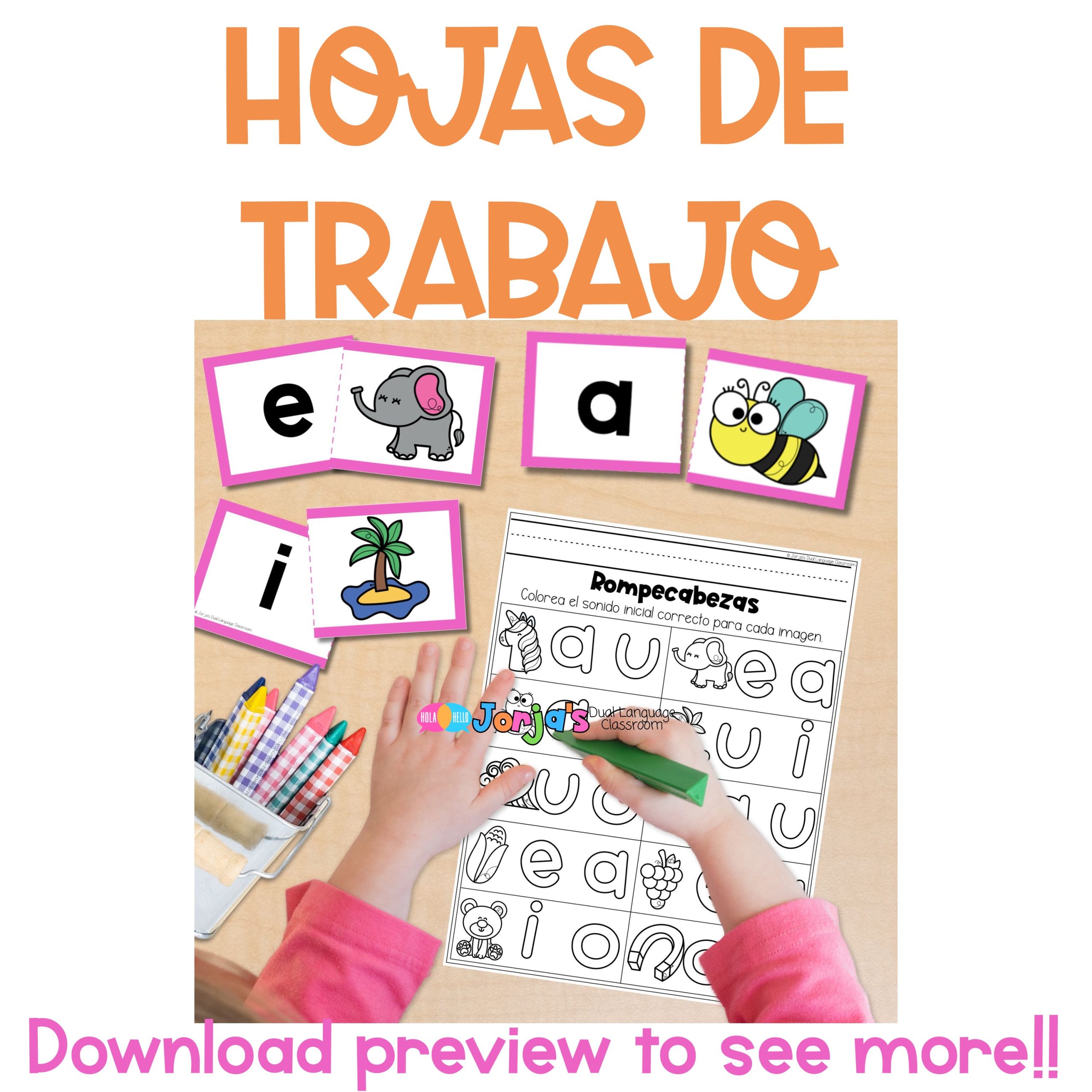 Centros de fonética Sonidos iniciales Las vocales – These beginning sounds activities in Spanish (sonidos iniciales en español) are perfect for preschool and kindergarten students who are learning to identify the first sound of a word. Designed to target las vocales in Spanish (a, e, i, o, u), this resource includes activities ideal for literacy centers, small groups, or at-home learning.