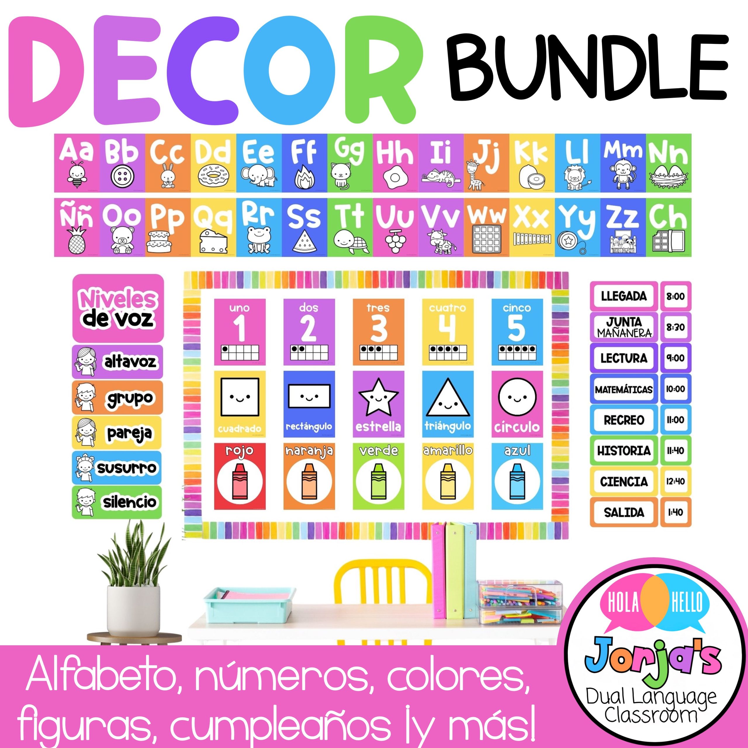 Spanish classroom decor, bilingual classroom bundle, decoraciones para salón en español, dual language setup, back to school en español, Spanish classroom alphabet posters, números y figuras en español