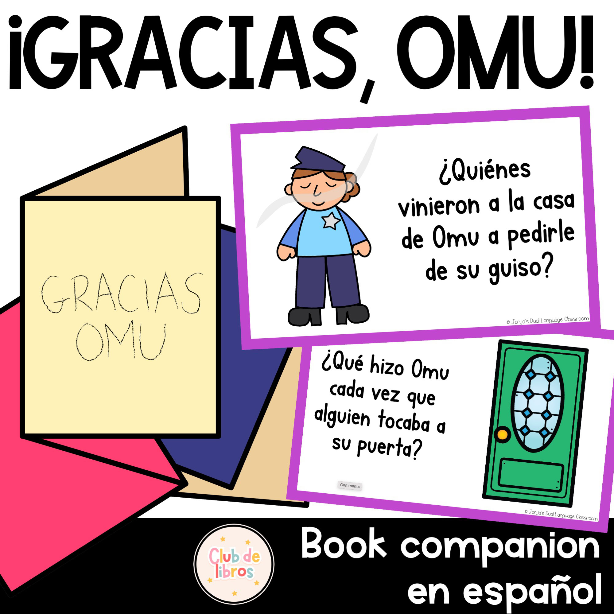 Gracias Omu Book Companion in Spanish – Este recurso de Gracias, Omu está lleno de actividades hermosas para trabajar comprensión lectora, vocabulario, escritura y gratitud en español. Los niños podrán volver a contar la historia, identificar el tema principal, hacer conexiones, escribir cartas de agradecimiento y hasta diseñar un mandil o una receta especial para Omu. Perfecto para acompañar el cuento Gracias, Omu de Oge Mora y para quienes buscan Spanish book companion, comprehension in Spanish, actividades de lectura y escritura en español.