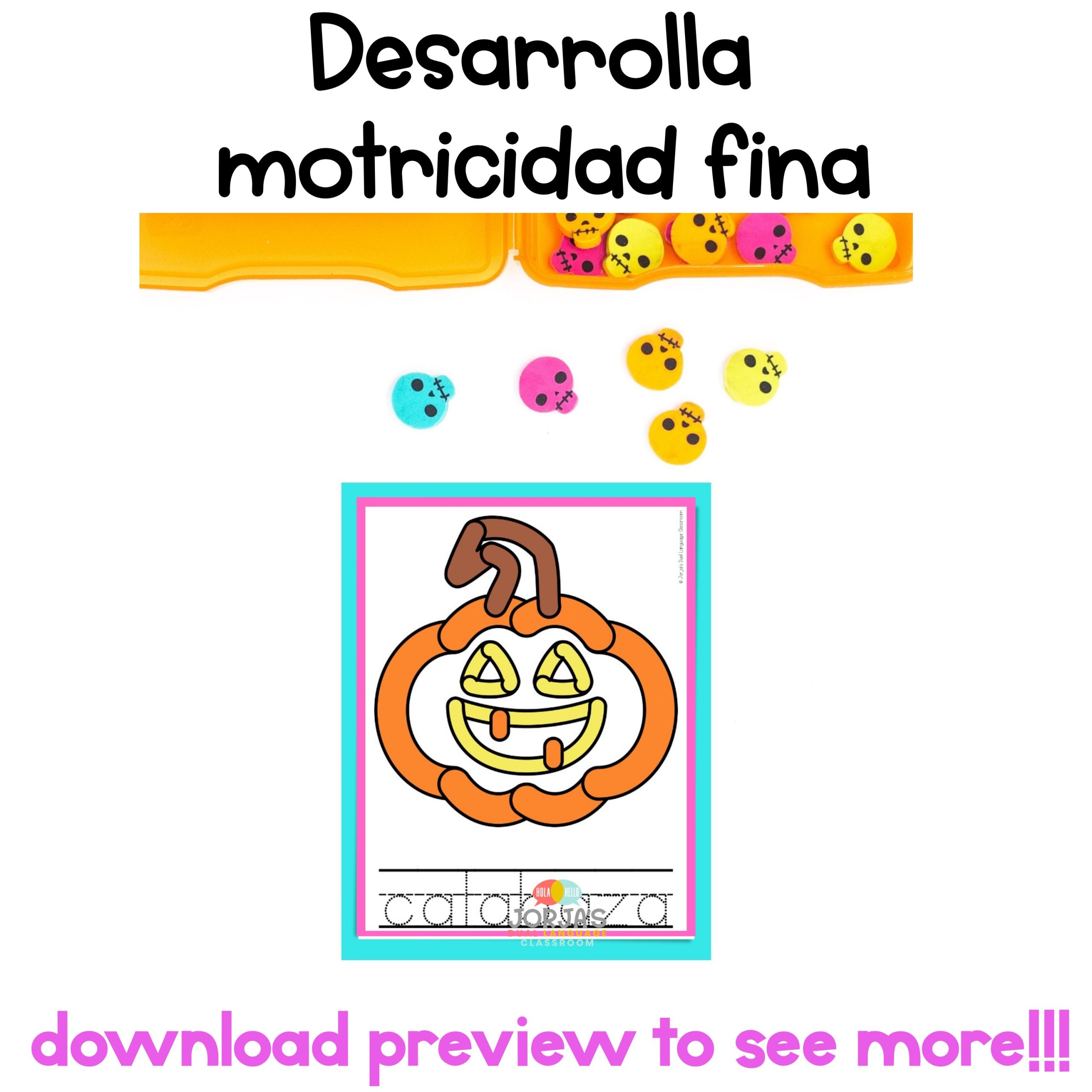 Esta actividad de motricidad fina (fine motor skills in Spanish) ayudará a tus estudiantes a ejercitar sus manos con plastilina. Utilizarán el material para construir una variedad de figuras de Halloween.