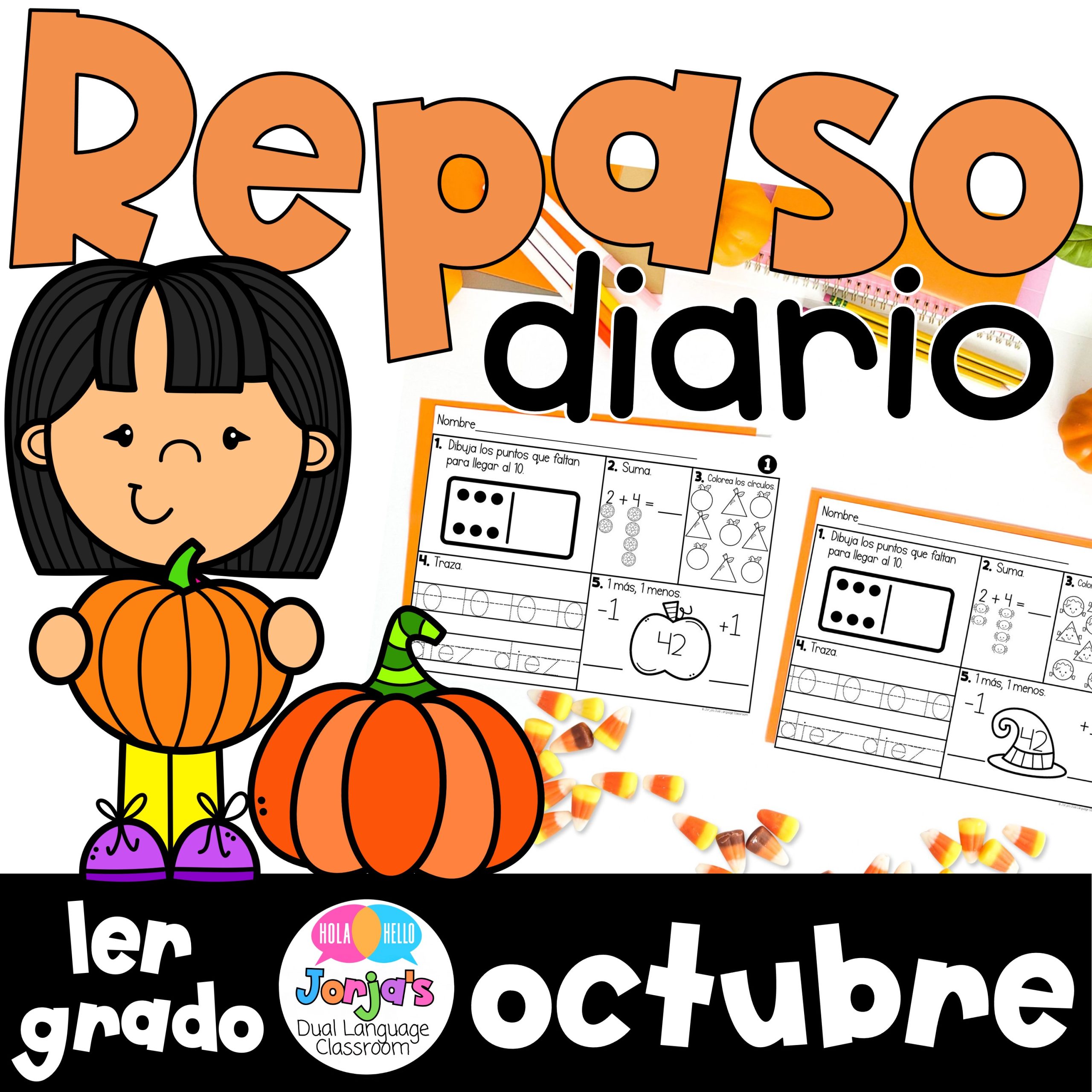 Repaso diario PRIMERO Otoño Octubre 1st grade in Spanish – Este repaso diario de matemáticas en español para primero de primaria es perfecto para el mes de octubre con un toque de otoño o Halloween. Los niños practican sumas, restas, conteo, trazo de números y más en hojas fáciles de seguir.
