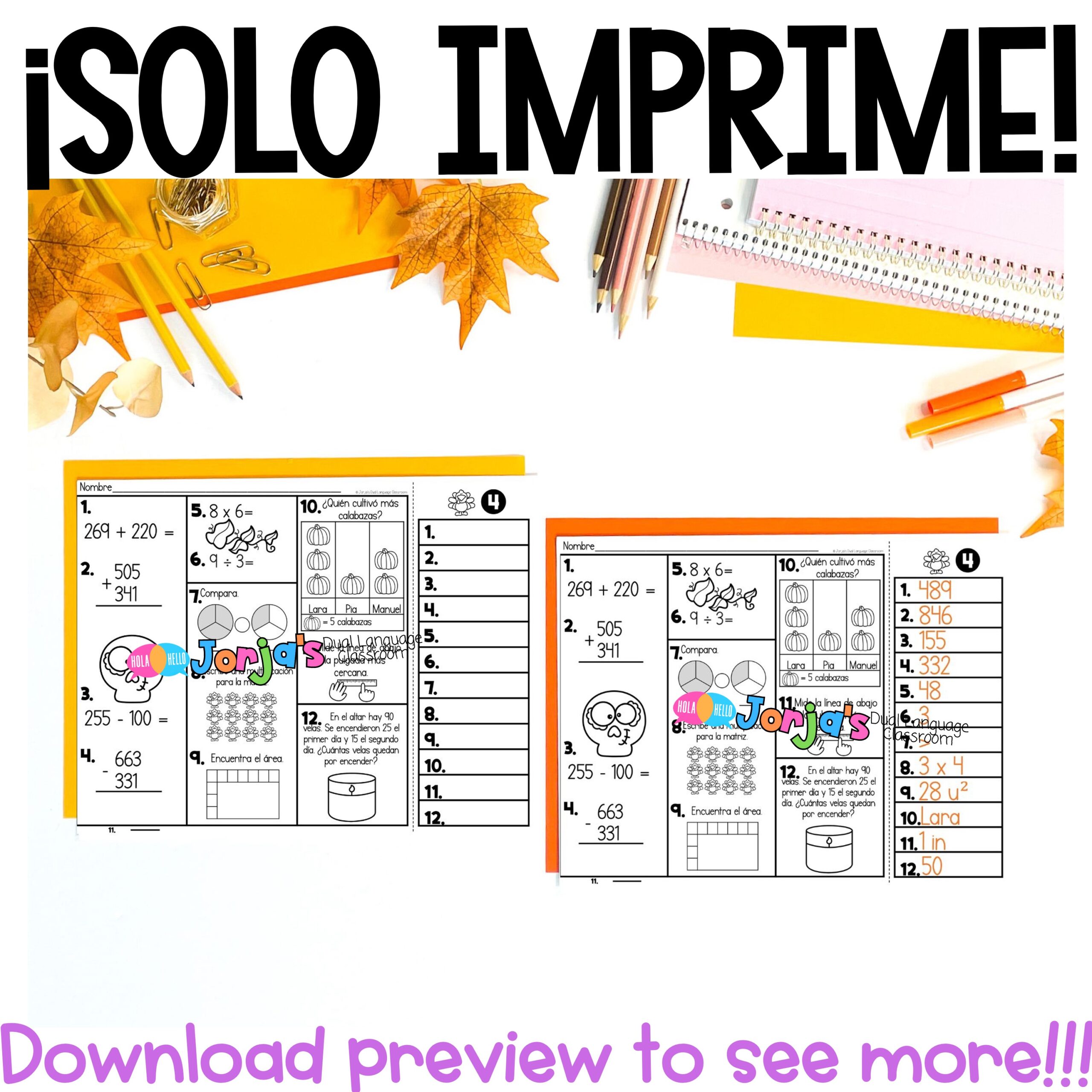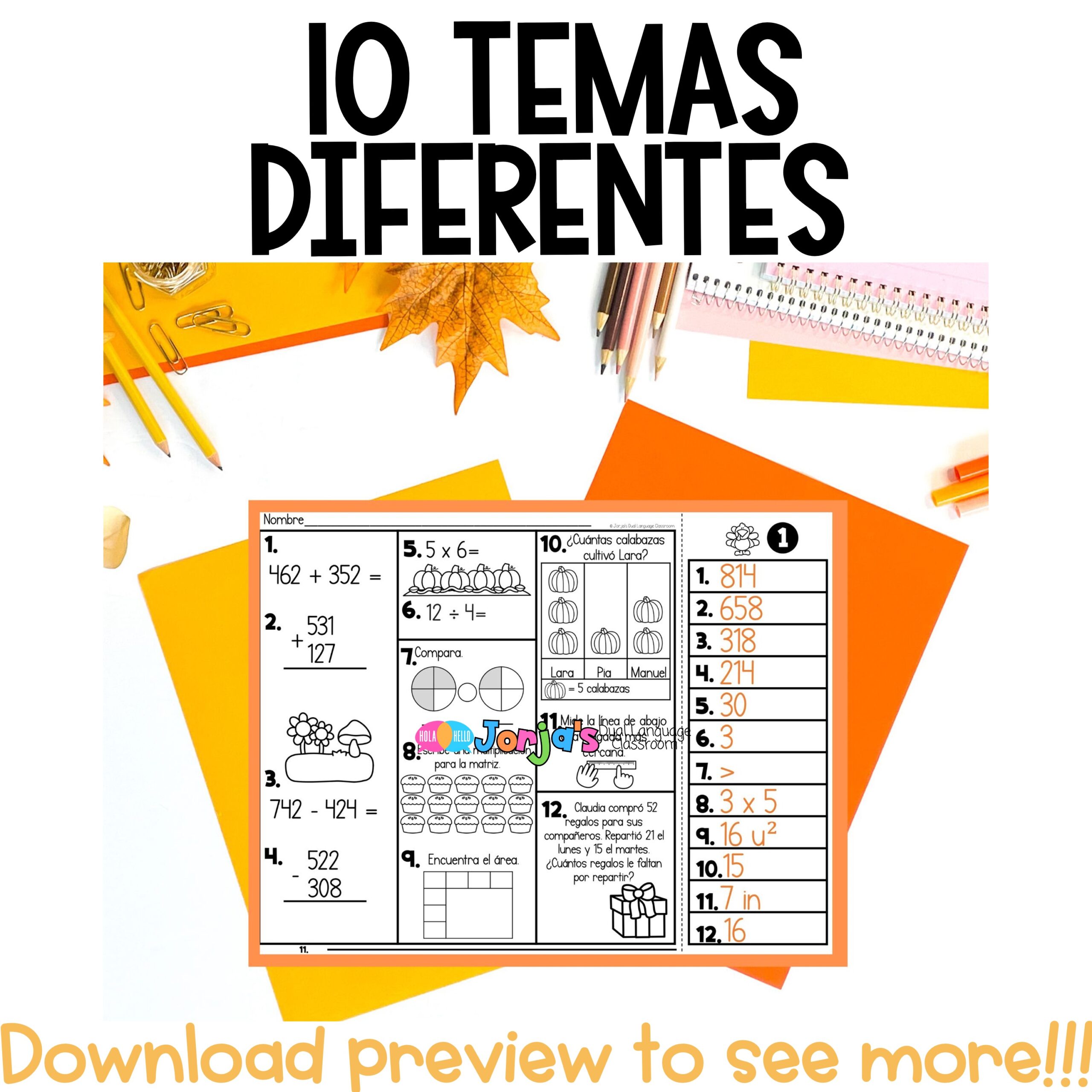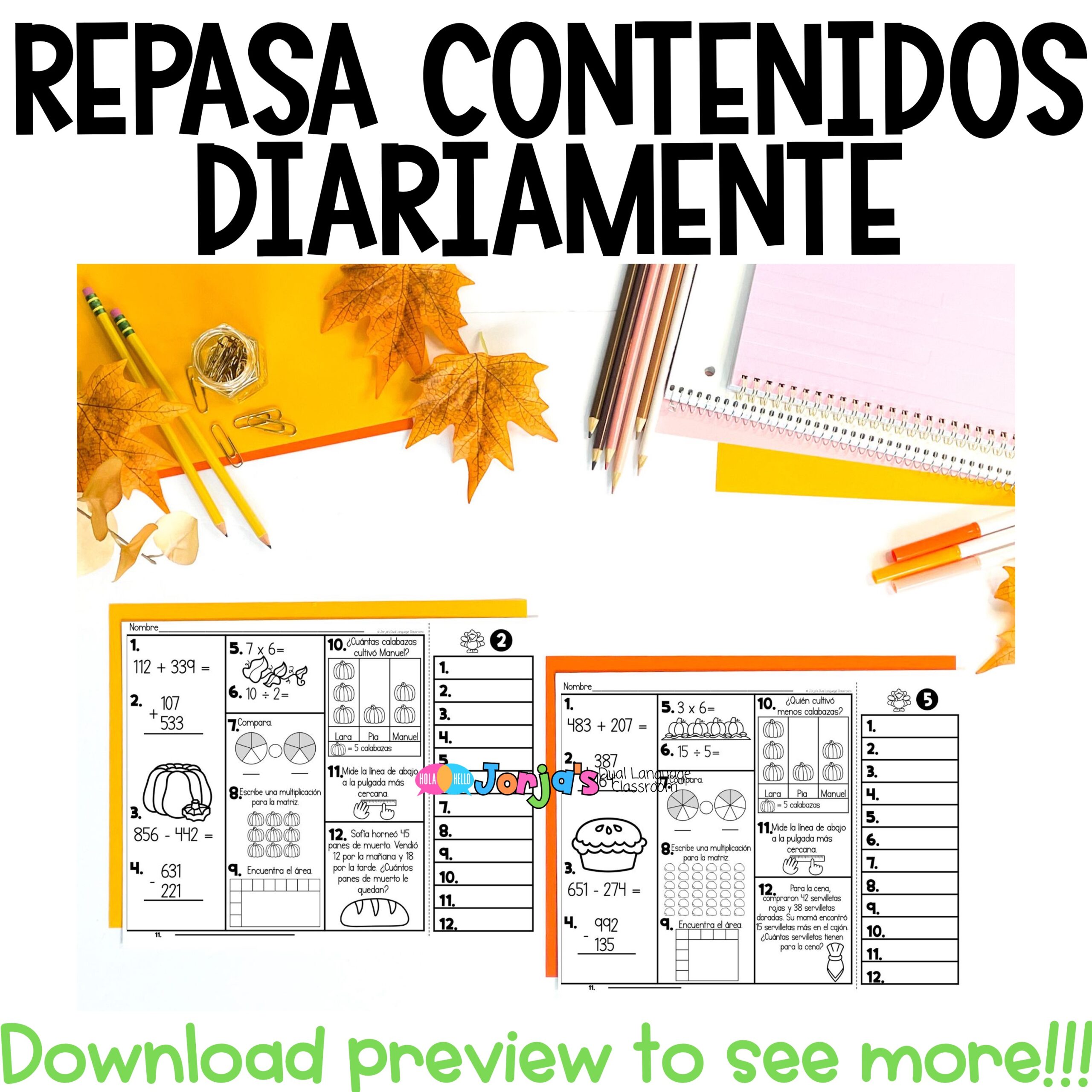 Este producto es perfecto para quienes buscan: repaso diario 3er grado en español, third grade math worksheets Spanish, hojas de matemáticas noviembre, actividades de otoño en español, daily math practice Spanish.