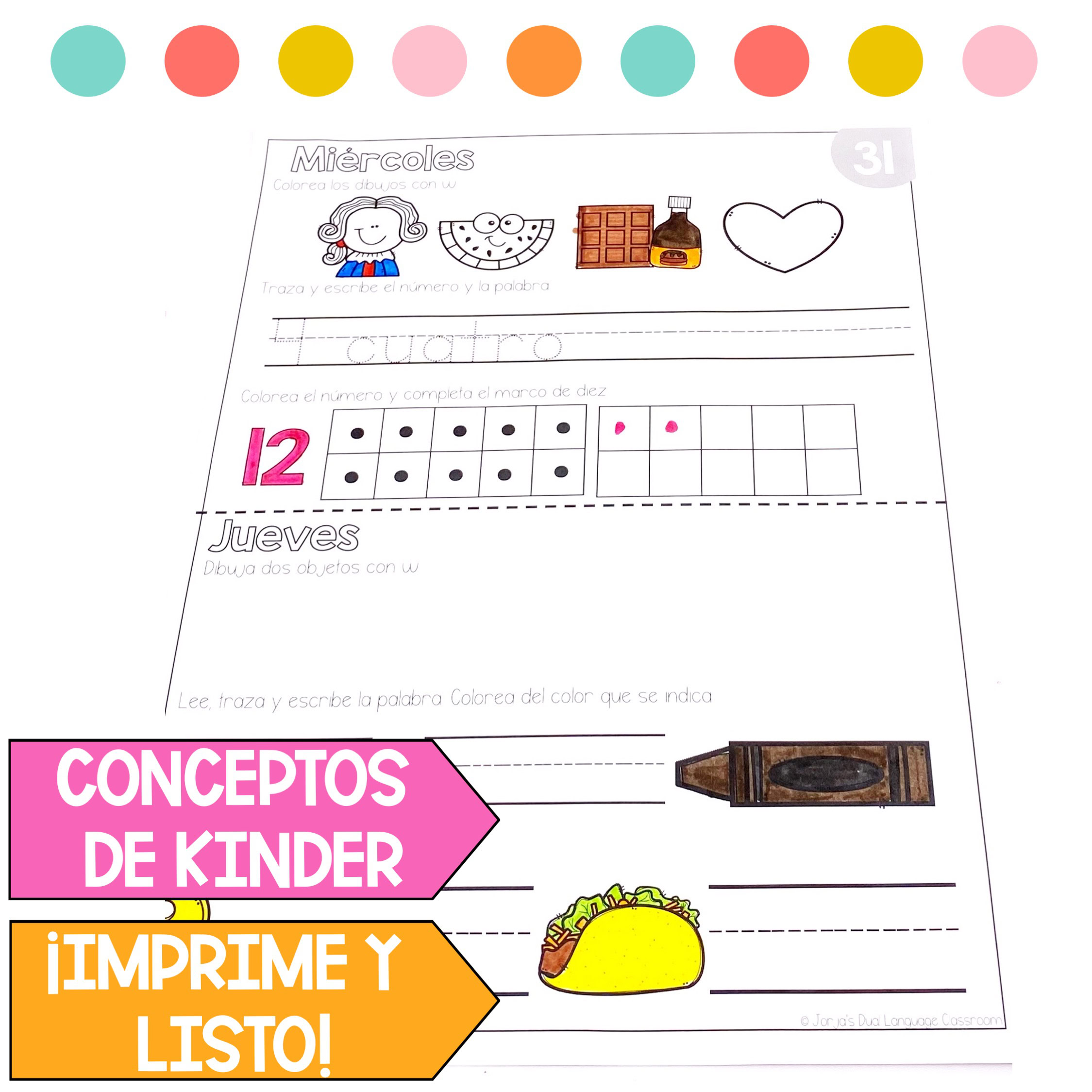 Este recurso incluye tareas listas para imprimir que cubren conceptos básicos de lectoescritura y matemáticas en español para kinder. Las actividades son breves, visuales y apropiadas para alumnos que están empezando a leer, escribir y contar.